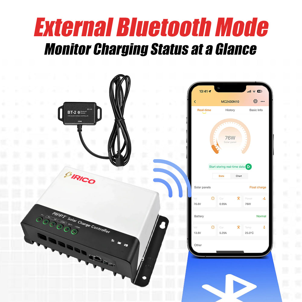 IRICO LC2430 Solar Charge Controller is a high-performance solution for advanced solar power systems, offering dual operating modes: charging priority and load priority. With an all-in-one design that supports multiple battery types, it simplifies installations while saving space and reducing wiring complexity. Equipped with MPPT technology, it delivers up to 99.9% efficiency, supporting two solar panels in series or more in parallel. External connections to an LCD screen, Bluetooth module, and GPRS module enable real-time monitoring and parameter adjustments. Designed for safety, it provides constant voltage output in 12V/24V, perfect for voltage-sensitive loads. Intelligent features include TTL, RS485 communication, and Bluetooth compatibility for seamless system management via a mobile app.